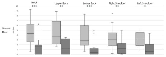 Pain intensity at baseline and post-intervention in the neck, upper back, lower back and right and left shoulders. Significant differences are marked with asterisks: * p < 0.05, ** p < 0.01 and *** p < 0.001.