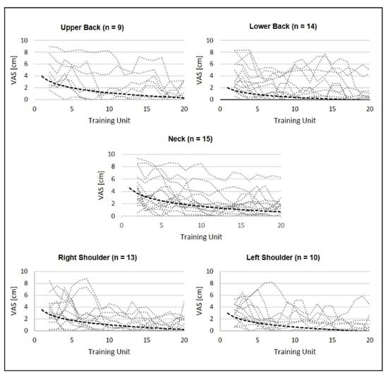 The individual pain intensity progression in the upper and lower back, neck and right and left shoulders over the 20 training units is illustrated in Figure 3. All five subfigures reveal a large scattering between the participants’ pain indications and the heterogeneous progression of the pain intensity. However, an overall trend in the reduction of pain intensity can be derived from each subfigure (Figure 3). This trend can also be seen at the individual level in all queried body regions. This shows that most subjects experienced only moderate to mild pain during the course of the intervention, whereas many experienced severe pain at baseline (Figure 3).