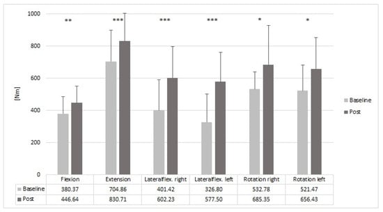 Effects of a 10-week resistance training programme on the MVIC of the trunk. The table shows the mean values of the MVIC at baseline and post-intervention for each outcome. Significant differences are marked with asterisks: * p < 0.05, ** p < 0.01 and *** p < 0.001.
