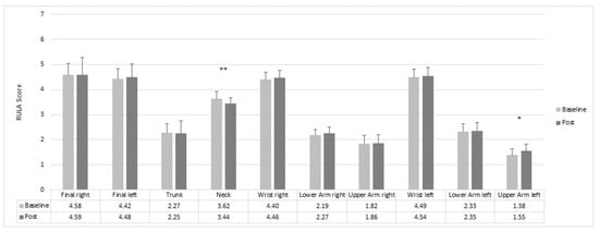 The participants showed a marginal change in the ergonomic risk following the 10-week resistance training intervention. Only for the neck could a significant improvement (p = 0.02) of the ergonomic risk be found—going from 3.62 to 3.44. In contrast, a significant worsening (p = 0.018) of the ergonomic risk from 1.38 to 1.55 was found for the left upper arm score (Figure 5).