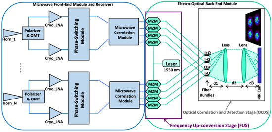 The prototype mounted in the laboratory is composed of a front-end module (FEM) connected to two microwave receivers, operating from 10 to 20 GHz, and an electro-optical back-end module (EOBEM) with a frequency up-conversion stage (FUS) at the input, connected to an optical correlation and detection stage (OCDS). It represents a solution for the implementation of ultrasensitive large-format interferometers to measure the polarization B-modes at the lowest frequencies of the CMB spectrum. The polarimeter was designed to measure the polarization of the microwave radiation from the sky, obtaining the I, Q, and U Stokes polarization parameters [38] of the incoming signal simultaneously, in a frequency range from 10 to 20 GHz. The microwave receivers of the polarimeter share the conceptual design of those of QUIJOTE experiment’s 30 and 40 GHz instruments (TGI and FGI); thus, the proposed methodology can also be applied to those cases. The detection stage is composed by the EOBEM with input microwave signals entering the NIR FUS, composed of a laser and a set of commercial Mach–Zehnder modulators (MZM), as well as an OCDS implemented basically with a fiber array, a pair of lenses, and a camera.