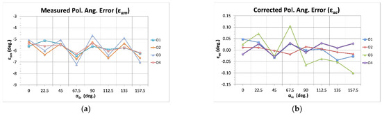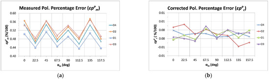 Measured polarization percentage error (εpPm, (a)) compared to the corrected ones (εpPc, (b)). The calibrated errors are represented here as a function of the input polarization angles (αin).
