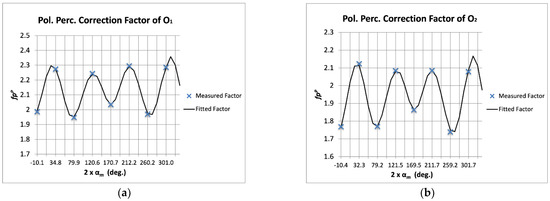 The parameter is again a representation of a “harmonic” frequency of the sinusoidal function that can be obtained by the multiplication of the measured polarization angle array and Ki, which is a real number representing that “harmonic” of the fitting function. Here also, Ki is optimized to minimize (fpPr − 1) taking values between 0 and Nm/2 because it is supposed a low-frequency evolution of the polarization percentage error. However, in cases where a higher-frequency evolution of that error is observed, Ki can take higher maximum values to fit accurately the variations of the εpPm.