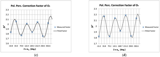 All the previous considerations can also be applied to the polarization percentage error or efficiency. Table 7 shows the evolution of the remaining errors when applying 1–5 multiplicative terms to the correction factors. It can be observed again that the error was reduced by around 50% with the application of each multiplicative term, but there were cases with lower error reduction. For instance, O4 resulted in a one-term error lower than O1 and O3, but the final error was higher due to reductions of only 26% and 32% after applying the fourth and fifth terms, respectively. Again, how close the remaining error factors follow a sinusoidal shape can explain this behavior. In relation to the number of terms to be used in the fit, if the requirement is about 1%, only three terms are needed; however, for more demanding requirements, a higher number of terms can also be applied.
