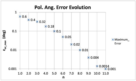 On the other hand, the number of terms to be applied depends on the requirements of each experiment and the corresponding accuracy of the calibration measurements. As explained in the previous section, there are experiments, with polarization angle error requirements of about 0.5°, which need only one or two terms. However, other experiments presenting higher sensitivity and, consequently, error requirements (for instance, on the order of 1 arc-minute [19]) would require five or more terms. Taking the maximum polarization angle error of the four outputs (εαr_max) as an overall reference for the polarimeter, Figure 7 shows its evolution while adding terms to the εαf function. It can be observed that, from one to four terms, the reduction in the maximum remaining error is quite slow, not reaching the previously quoted 50% reduction factor. However, from four to 10 terms, the reduction factor reaches almost perfectly 50% (higher in some cases), allowing to reach the fitting error level required by any experiment.