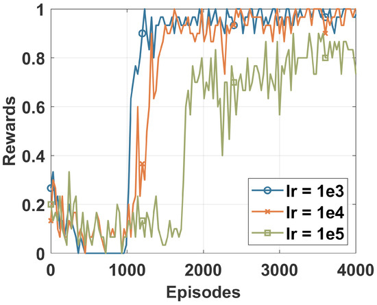 Figure 2 plots the cumulative reward of the DRL agent at each episode of the training process. The DRL agent was fed with a dataset sample at each episode to learn to identify different classes of the DS2OS dataset. Different learning rates were used to identify the most adequate for our study that provided stable learning for the agent. We can say that the learning rate of 0.0001 achieved the best convergence, as shown by the blue curve in Figure 2. The convergence of the DRL agent is achieved when its learning curve becomes flat and stops increasing. Only the results of the DRL trained using an LR of 0.0001 are used in the following.
