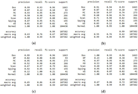 Multiclass classification report. (a) Normal DRL. (b) DRL with . (c) DRL with . (d) DRL with .