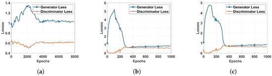 Losses of the Generator and Discriminator: (a) trained on full dataset (b) trained on WS class (c) trained on DP class.