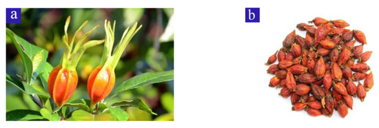 Gardeniae Fructus (GF) is the dried ripe fruit of Gardenia jasminoides Ellis (Figure 1) of the Rubiaceae family. It has a long history of use, was originally recorded in Shennong’s Herbal Classics, and is found in many Asian countries, including China, Japan, Korea, Vietnam, India, and Pakistan [1]. GF is a dual-use resource for both medicine and food.