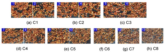 The images of the GFP at various stir-frying degrees were collected. To ensure the consistency of the samples, every image was captured under the same conditions. We took pictures using a Xiaomi 10 s at a 1600 × 1200 pixel resolution and saved them in JPEG format. The stir-frying degree was divided into 8 stages. The change in the early stage of stir-frying was small, so the first 10 min were divided into stages of 2 min. As there was an obvious change in the later stage of stir-frying, which was close to the average stir-frying degree, the later sample was divided into a stage for every minute, including 1–2 min, 3–4 min, 5–6 min, 7–8 min, 9–10 min, 11 min, 12 min, and 13 min. These images were recorded as C1, C2, C3, C4, C5, C6, C7, and C8, respectively. Figure 2 shows the sample images of GFP under different stir-frying stages.