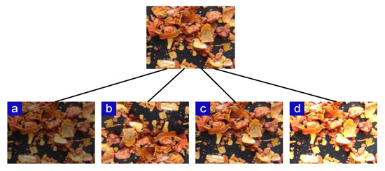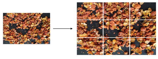 To obtain samples of the different stages, as well as simulate the state of GFP stir-frying as much as possible and acquire as many images as possible, we randomly disrupted the samples being photographed. In total, 16 images were taken for each minute of sample acquisition, with a total of 208 images acquired. Subsequently, each image was evenly divided and cropped into 9 images with 533 × 400 pixels, totaling 1872 images, as shown in Figure 3.