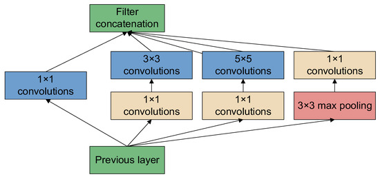 GoogLeNet [43] is a new deep learning structure proposed by Szegedy et al. [44]. The innovation lies in its Inception structure, which expands the depth and width of the whole network. The structure diagram of the Inception module is shown in Figure 6, which consists of three convolutions (1 × 1, 3 × 3, 5 × 5) and one pooling layer, and a 1 × 1 convolution immediately before each convolution and after the pooling layer. This reduces the number of parameters while extracting richer features. The GoogLeNet network based on the Inception module contains three convolutional layers and nine Inception modules. The network structure of GoogLeNet is shown in Figure 7.