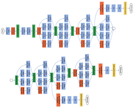 - Szegedy, C.; Liu, W.; Jia, Y.; Sermanet, P.; Reed, S.; Anguelov, D.; Erhan, D.; Vanhoucke, V.; Rabinovich, A. Going Deeper with Convolutions. In Proceedings of the IEEE Conference on Computer Vision and Pattern Recognition, Boston, MA, USA, 7–12 June 2015; pp. 1–9. [Google Scholar]