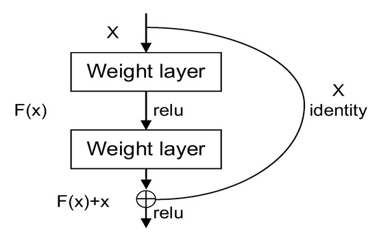 To solve the problems of gradient disappearance and gradient explosion caused by the deepening of network layers, He et al. proposed the ResNet [35] residual network in 2015 [45]. The structure of the residual block is shown in Figure 8, where the input of the residual block is x and the output is F(x) + x.