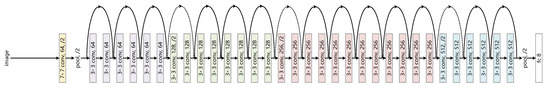 F(x) is the residual function, and the model only needs to learn the residual function F and minimize the residual function F(x) to solve the network degradation problem and enhance the network performance. Different numbers of residual modules are stacked to form ResNet networks with different numbers of layers. Classical networks have 18 layers, 34 layers, 50 layers, 101 layers, etc. Given the complexity of this problem and the device environment, we chose ResNet-34 for training; the network structure of ResNet-34 is shown in Figure 9.