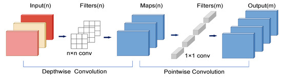 The MobileNet model [36,37,38] is a lightweight deep neural network proposed by Google for embedded devices such as cell phones [46]. The core idea is depthwise separable convolution. Depthwise separable convolution consists of depthwise (DW) and pointwise (PW) channels. DW is a channel that is convoluted by a convolution kernel, and the number of feature map channels generated by this process is the same as the number of input channels. PW is equivalent to an ordinary convolution operation, but the size of the kernel is 1 × 1 × M. M is the number of channels in the previous layer. PW combines the previous Feature Map in the depth direction to generate a new Feature Map, which can greatly reduce the amount of model computation and model parameters. The depthwise separable convolution is shown in Figure 10.