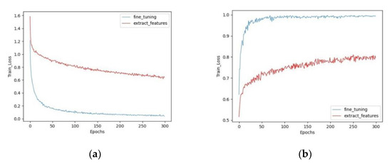 Figure 13 shows the validation accuracy (val_acc) and training loss (train_loss) values of MobileNetV3 trained with two different transfer learning methods, respectively. In Figure 13a, the horizontal coordinates indicate the epochs and the vertical coordinates indicate the train_loss values. The train_loss values decrease rapidly with an increase in the training epochs, followed by a slow decrease and eventual stabilization. In Figure 13b, the horizontal coordinate indicates the epochs and the vertical coordinate indicates the val_acc. In our study, we trained a total of 300 epochs. It can be seen that fine-tuning performs significantly better than feature transfer. The fine-tuning method stabilizes after 300 epochs, with a train_loss value of 0.057 and a val_acc value of 0.994, whereas the feature transfer train_loss value is still slowly decreasing and the val_acc value is slowly increasing, with a train_loss value of 0.691 and a val_acc value of 0.796. The convergence speed of fine-tuning method is also faster, while the feature transfer method needs more iterations to converge slowly. This may be accounted by the fact that the size of our dataset is small and has a low similarity to the pretrained dataset ImageNet. When we freeze the previous layers and train only the fully connected layers, it is difficult for the feature extraction layer of the pretrained model to learn the GF features from the image [49]. Thus, fine tuning all the layers achieves better performance.