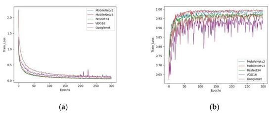 Five currently popular classification networks were compared, and all models were trained on our dataset with 300 epochs. Figure 14 shows the val_acc and train_loss of the five networks trained. VGG16’s train_loss had several peaks during convergence, and its validation accuracy was even more volatile. In contrast, the other models slowly and steadily converged during training. Upon analysis, a possible reason for this is that no suitable optimizer or learning rate hyperparameters were chosen for VGG16, resulted in large fluctuations in model performance. In terms of training loss, it can be seen that of all the models, MobileNetV3 demonstrated the smallest loss, followed by ResNet34 and MobileNetV2. In terms of validation accuracy, MobileNetV3 is the most accurate, followed by MobileNetV2.