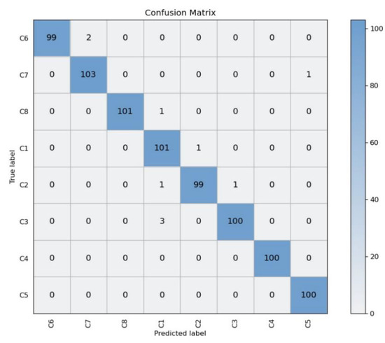 We used a confusion matrix to further analyze the performance of MobileNetV3 on the test dataset. As shown in Figure 15, C1~C8 represent the eight categories representing each stage of stir-frying GFP. Each row represents the real category, and each column represents the predicted category. Each number in the table corresponds to the number of data points in the row category predicted as the column category, where the diagonal line is the number of correct predictions. It can be seen that two images of stage C6 are predicted as stage C7; one image of stage C7 is predicted as stage C5; one image of stage C8 is predicted as stage C1; one image of stage C1 is predicted as stage C2; two images of stage C2 are predicted as stage C1 and stage C3, respectively; and three images of stage C3 are predicted as stage C1. All other predictions are correct.