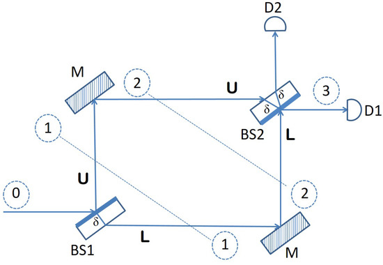 According to Equation (8) above, the final state of the photon is not a superposition, but just the basis vector with a global phase in front of it, which accounts for the optical path traversed by the photon through the transparent material making up a beam splitter. The physical interpretation of this is that any photon directed toward a Mach–Zehnder interferometer horizontally, from the left side, as Figure 1 shows, will always emerge horizontally, on the other side, and be detected by photon detector D1. The reason for this behavior is the interference taking place at the second beam splitter between the component traveling through the lower arm L and the component going through the upper arm U. This interference is destructive for the component, canceling it from the final state, and it is constructive for , reinforcing its amplitude in the final state .