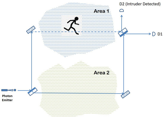 - Case I: Intruder disrupts the optical path traversing Area 1 and/or Area 2.This scenario amounts to a quantum measurement on the position of the photon after the initial beam splitter. The superposition may collapse onto the upper arm, with chance, or onto the lower arm, again with chance.Upper Arm: The photon is absorbed or reflected by the intruder, and none of the detectors register the photon. The intruder has been detected.Lower Arm: The photon traverses Area 3 and the entire Mach–Zehnder interferometer that follows, reaching the final beam splitter coming from Area 14. Here, there is a 50–50 chance of being detected by either D3 or D4. If D3 clicks, then the intruder is correctly detected. If D4 clicks, the outcome is inconclusive.Overall, considering both options, there is a probability of detecting the intrusion (no click or D3 clicks) and a probability of an inconclusive outcome (D4 registers a click).