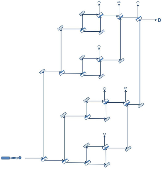 Furthermore, the arrangement depicted in Figure 2 can be extended in order to cover a larger area in the following way. After the initial beam splitter creates the superposition in the photon position, each of the two paths, the lower arm and the upper arm, goes again through a full Mach–Zehnder interferometer before reuniting at the final beam splitter. The entire arrangement together with the possible areas that can be surveilled in this way are shown in Figure 3.