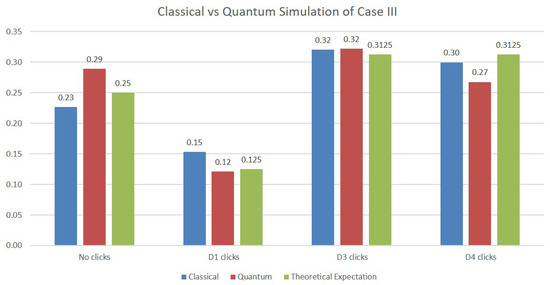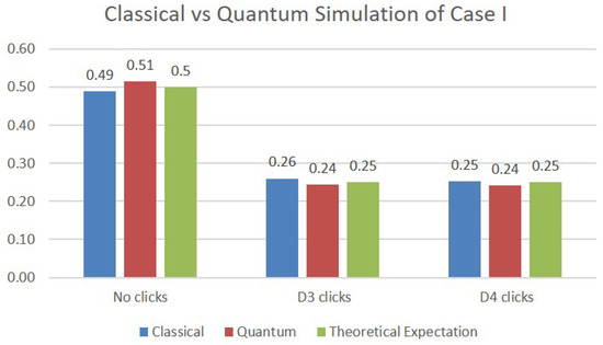 In the simulation of Case III, two additional qubits are necessary in order to model the two beam splitters making up the upper Mach–Zehnder interferometer. The results of the simulations are depicted in Figure 6. Although the values obtained are again close to the expected probabilities from the theoretical analysis, we note that the quantum simulations deviate more from them compared with the classical simulations. This is certainly to be expected, since the values on the quantum simulations are obtained on an actual physical quantum machine whose operation is subjected to quantum errors.
