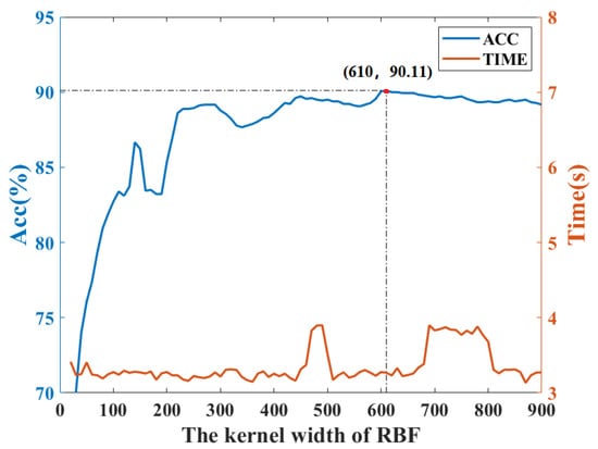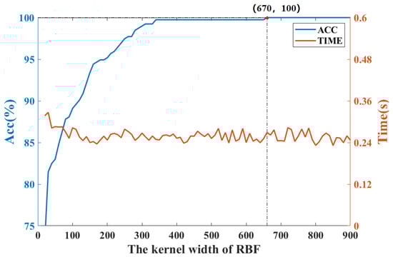 Accuracy rate and computation time vs. kernel width of RBF: CWRU dataset.
