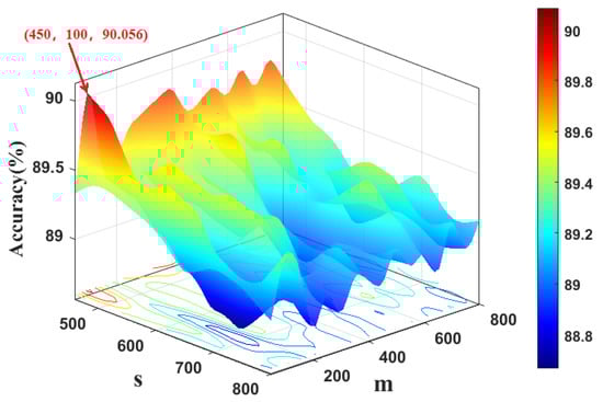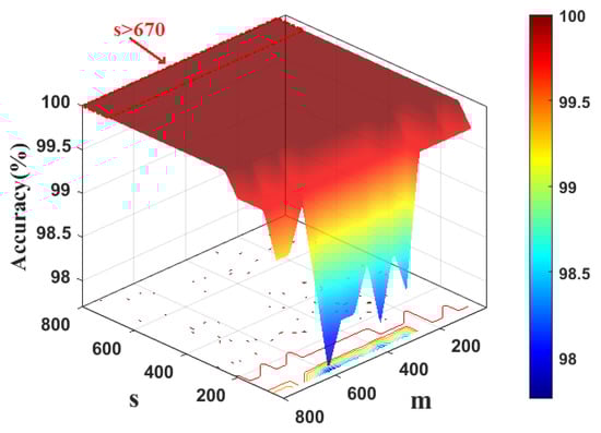 To determine the kernel width of KFDA, the cross-validation method is used. Figure 3 shows the fault classification results of the KFDA model with different kernel widths. From Figure 3, the optimal kernel width is selected as 700. The computation time is kept stable (i.e., 0.24 s). To make the comparison fair, the same kernel width s is used for RFDA. Since the selection of dimension m not only affects the performance of approximation of kernel matrix, but also requires different computational burdens in RFDA-based fault diagnosis method. To obtain optimal parameters of RFDA, the accuracy rates with different parameters are plotted in Figure 4. We can set from Figure 4. The number of maintained latent variables is selected as 3 for all methods.