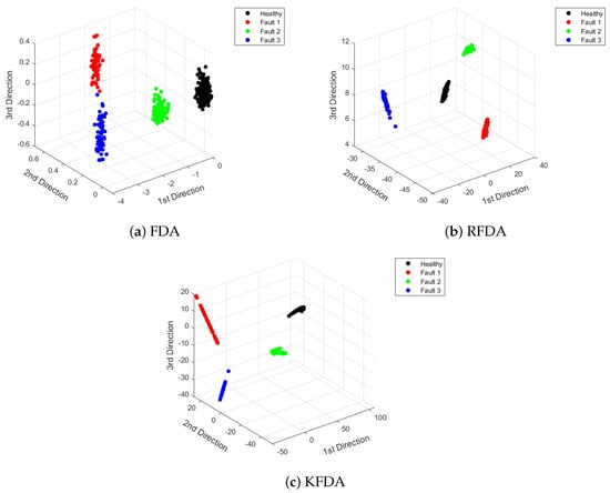 Figure 9 is used to display the projections onto the first three FDA loading vectors by standard FDA, KFDA and RFDA. As plotted in Figure 9, it can be observed that the distances between the clusters of different classes are closer. Thus, the fault diagnosis performance will degrade. The reason is that the magnitudes of faults in the PU datasets are smaller. The vibration signals contain more noise. However, the clusters derived by RFDA and KFDA have larger discrepancy than FDA. Thus, higher accuracy rates can be offered. Nevertheless, KFDA and RFDA can provide better discriminant ability than FDA.