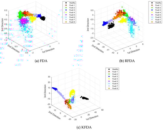 Table 6 offers the accuracy rates and computation times of FDA, KFDA, and RFDA using the testing dataset. From the data in Table 6, the accuracy rates of FDA and KFDA are below . RFDA can provide a slightly higher accuracy rate (i.e., ) than KFDA. However, KFDA and RFDA can derive better fault diagnosis performance than FDA. For computation time, FDA requires the lowest computation burden compared to KFDA and RFDA. As demonstrated in the case study of PU, the computation time of RFDA is close to that of the FDA. The average computation time of RFDA is 1.43 s. Due to the need for calculating the kernel matrix, the average computation time of KFDA (i.e., 3.24 s) is longer than that of FDA and RFDA.