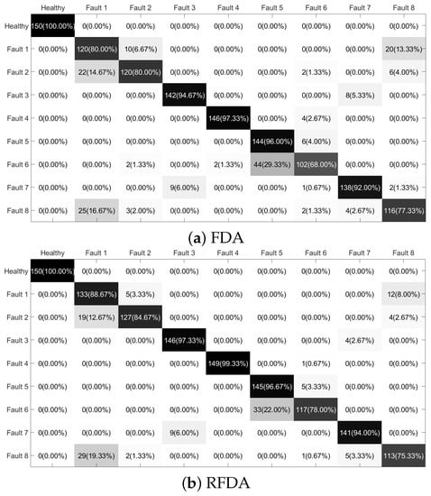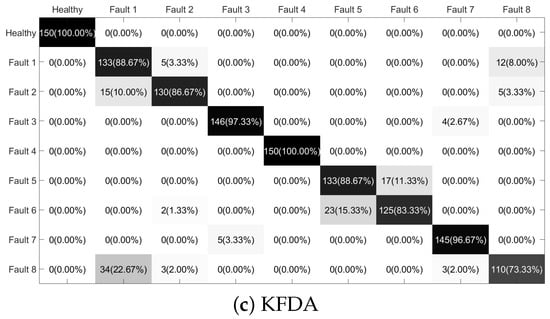 To investigate the performance of the proposed RFDA based fault diagnostic system further, the confusion matrices are plotted in Figure 10. From the data in Figure 10, values in the black squares on the diagonal indicate the classification accuracy, while values in the other gray-white squares indicate the error rate of the corresponding sample type. Most of the samples are correctly classified. However, it can be seen that the samples collected under Fault 6 are misclassified as Fault 5 for all methods. Among the comparable methods, fewer samples of Fault 6 are misclassified using RFDA. Overall, the RFDA-based method can offer satisfying results in the field of computation time and accuracy rate.