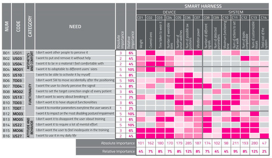 It was possible to select some of the needs expressed by the user groups and evaluate their relationships to some measurable characteristics of the smart device and the system developed in this design cycle. The characteristics were selected with the help of the TOs to ensure their relevance. The quality function deployment (QFD) tool, primarily conceived for the evaluation of design strategies in companies, was modified to be more accessible to the multidisciplinary team members [29]. It was used to create a hierarchy matrix of the project’s characteristics in light of users’ needs, highlighting the characteristics with the highest potential for innovative and pervasive impacts on the project [26]. The whole team was then asked to score each need so that the ones to be inserted in the matrix would be the most impactful. After this step, the team scored the degree of relationship between every need and every characteristic (Figure 1). The scores were reported at the intersections of lines (needs) and columns (characteristics) using the following classification.