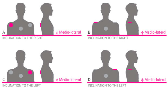 To rehabilitate mediolateral trunk inclination (as represented in Figure 4), the SWs were put against the shoulder blade or the shoulder. These positions were directly on the bones, guaranteeing a better cue transmission.