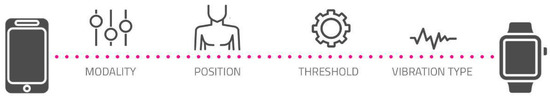 The haptic cues were sent on demand via an ad hoc multi-platform app, using the SW as an actuator (to mimic the operation of the final mHealth system); the smartphone sent the sensory cues on demand.