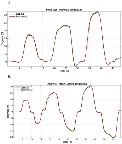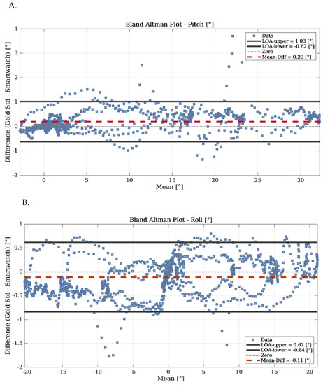 We used Bland–Altman plots to compare the estimations (see Figure 12). The differences between the pitch and roll angles obtained with our SW algorithm and with the gold standard are reported.