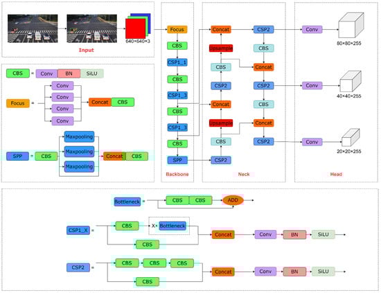 The YOLO series algorithm is a target detection algorithm based on deep learning and the convolutional neural network, which has the advantages of fast inference, high detection accuracy, and real-time detection. With the rapid development of deep learning in machine vision, the YOLOv5 algorithm has emerged. Compared to previous generations of algorithms, YOLOv5 has higher accuracy, faster speed, and smaller size. YOLOv5 contains four derived models, including YOLOv5s, YOLOv5m, YOLOv5l, and YOLOv5x. They have the same model architecture, but the model depth and width increase sequentially. Therefore, YOLOv5s was chosen as the benchmark model to build the roadside object detection algorithm. The YOLOv5s network structure is shown in Figure 2.