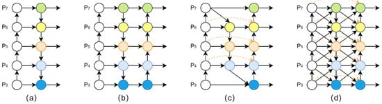 Iterative design of feature pyramid network from level 3 to level 7 (P3-P7). (a) FPN proposes a top-down pathway to aggregate multiscale features; (b) PANet adds an additional bottom-up pathway based on FPN; (c) BiFPN adds a bidirectional cross-scale pathway based on PANet; (d) GFPN introduces a queen-fusion pathway and skip-layer connection method based on PANet.