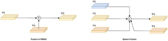 Sufficient information exchange should contain both skip-level connection and cross-scale connection. However, previous works in aggregating features of adjacent layers only consider the same-level feature or previous-level feature, which leads to poor performance in scenarios with large-scale variance of objects. Therefore, queen fusion was proposed to overcome large-scale variation, and the structure is shown in Figure 6. Each node receives input not only from the previous node but also from the nodes above and below it diagonally, which helps target features for effective information transfer and improves the adaptability of the network to different scale features. Moreover, the fusion style of GFPN uses the concatenation method instead of the summation method, which effectively reduces the loss of feature fusion.