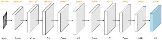In order to accurately identify and localize small targets in object-dense scenarios, we integrated the CA attention mechanism in the YOLOv5s Backbone network to enhance the important channel and spatial feature information in the features, and the improved Backbone network is shown in Figure 8. The CA attention mechanism added at the end of the Backbone network not only does not increase the network parameters and model computation but also facilitates the extraction of important feature information.