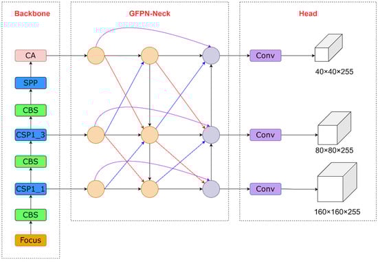 The improved network structure for RD-YOLO. The 32× downsampling feature fusion layer is removed. The 4× downsampling feature fusion layer is added. The CA attention mechanism is inserted behind the Backbone. The PANet is replaced by GFPN to fuse the multiscale features. The CIOU Loss function is replaced by Focal-EIOU Loss to enhance the regression efficiency.