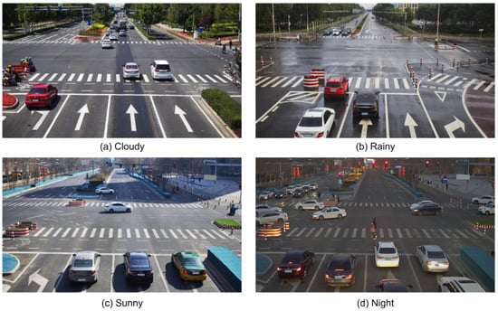 In this paper, the Rope3D [] dataset is used for the training and validation of the roadside object detection algorithm. Meanwhile, the annotation file is modified by using 2D boxes to label the detection targets. The Rope3D dataset is challenging. The roadside cameras are mounted on a roadside pole rather than on top of the car, so there are cases of different configuration conditions, including different parameters of the image acquisition equipment, different detection angles, and different installation heights. Moreover, the roadside view has a larger perception range, allowing more objects to be observed, which increases the difficulty of detection. Therefore, the Rope3D dataset fits well with the research context of this paper, and multiclass detection targets and multiple scenarios of the Rope3D dataset are beneficial to validate the performance of the model in various situations. Part of the roadside images is shown in Figure 10.