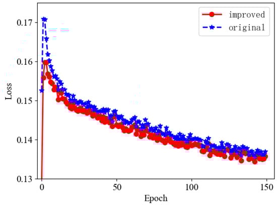 In order to confirm the effectiveness of the proposed improved loss function, we conducted loss function comparison experiments. During the experimental training process, we found that the curve of the loss function was stable when the epoch reached 150, so we terminated the training, and the training results are shown in Figure 11.