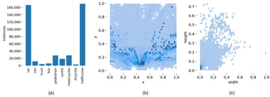 The visualization result of the analysis of the Rope3D dataset. (a) The distribution of detection object category and label. (b) The distribution of detection object center locations. (c) The distribution of detection object sizes.
