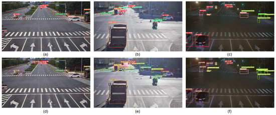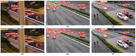 Comparison of YOLOv5s and RD-YOLO detection results on the UA-DETRAC dataset. (a) YOLOv5s detection result of No. 1 image. (b) YOLOv5s detection result of No. 2 image. (c) YOLOv5s detection result of No. 3 image. (d) RD-YOLO detection result of No. 1 image. (e) RD-YOLO detection result of No. 2 image. (f) RD-YOLO detection result of No. 3 image.