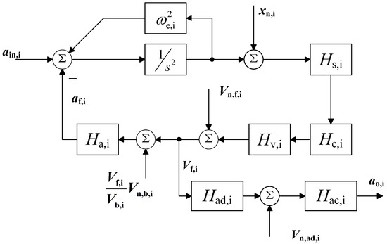 When there is an input acceleration, such as 1-g, will not be equal to 0. The polarization voltage noise is introduced into the accelerometer’s output as an out-of-loop signal. When there is no input acceleration outside, the influence of polarization voltage can be negligible ( = 0), which is equivalent to the traditional accelerometer noise model.