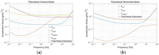 Theoretical noise estimation in (a) Vertical and (b) Horizontal directions, including the noise of the sensor circuit, HV amplifier circuit, and Readout system, which is the primary limitation of the total noise, are all converted to acceleration.