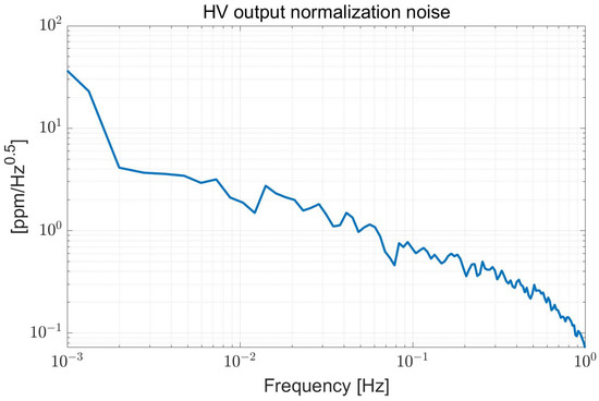 The HV power supply is generated by a DCDC module, which can provide a maximum voltage of 1000 V to the circuit, and the power supply noise is about 4 . Since the amplifier circuit’s power supply rejection ratio is over 120 dB at low frequency, the power supply’s influence is negligible. The HV output is tested and normalized to evaluate its characteristics, and the normalization result equals mentioned in Section 2.3.