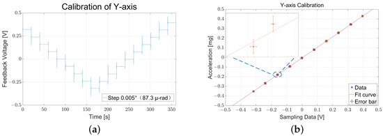 After the electrostatic compensation to suppress the influence of asymmetry, the scale factor calibration of the prototype is also carried out on the positing platform, with the sensitive axis adjusted between ∼ with respect to the horizontal (equivalent to applying a gravitational loading between −0.4∼0.44 mg) in 0.005 steps monitored by autocollimator simultaneously, plotted in Figure 7a.