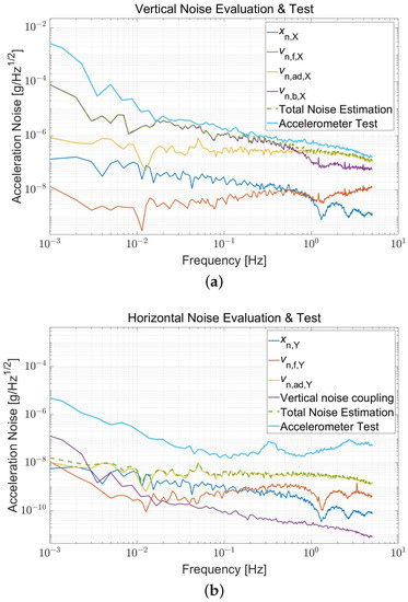 The theoretical noise floors of the accelerometer are about 0.35 in the vertical direction and 3.3 n along the horizontal, respectively, as shown in Figure 4. According to Parseval’s theorem, bias stability can also be estimated by the intrinsic noise of the accelerometer. The estimated stabilities of the accelerometer are approximately 5 g (Vertical) and 0.2 g (Horizontal), respectively, in 24 h at a 10 Hz sample rate.